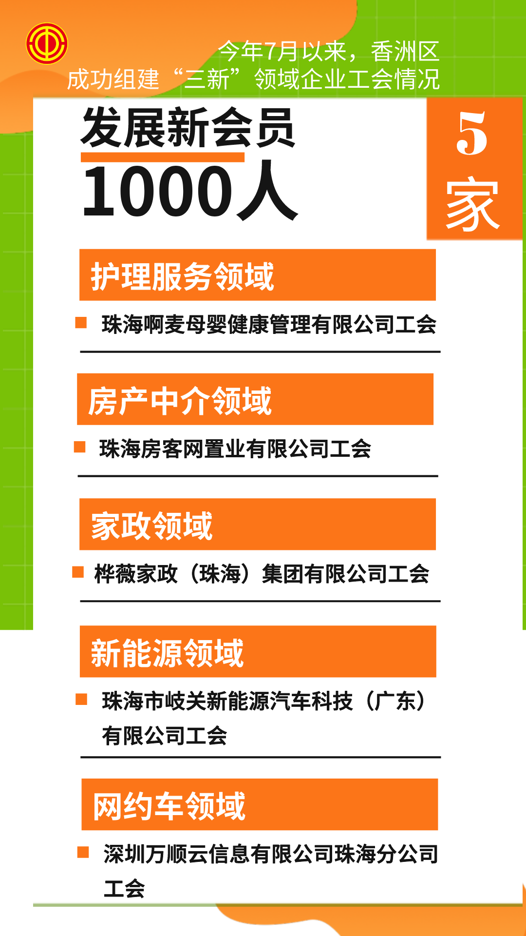 今年7月以来,香洲区成功组建“三新”领域企业工会5家,新发展会员近千人。