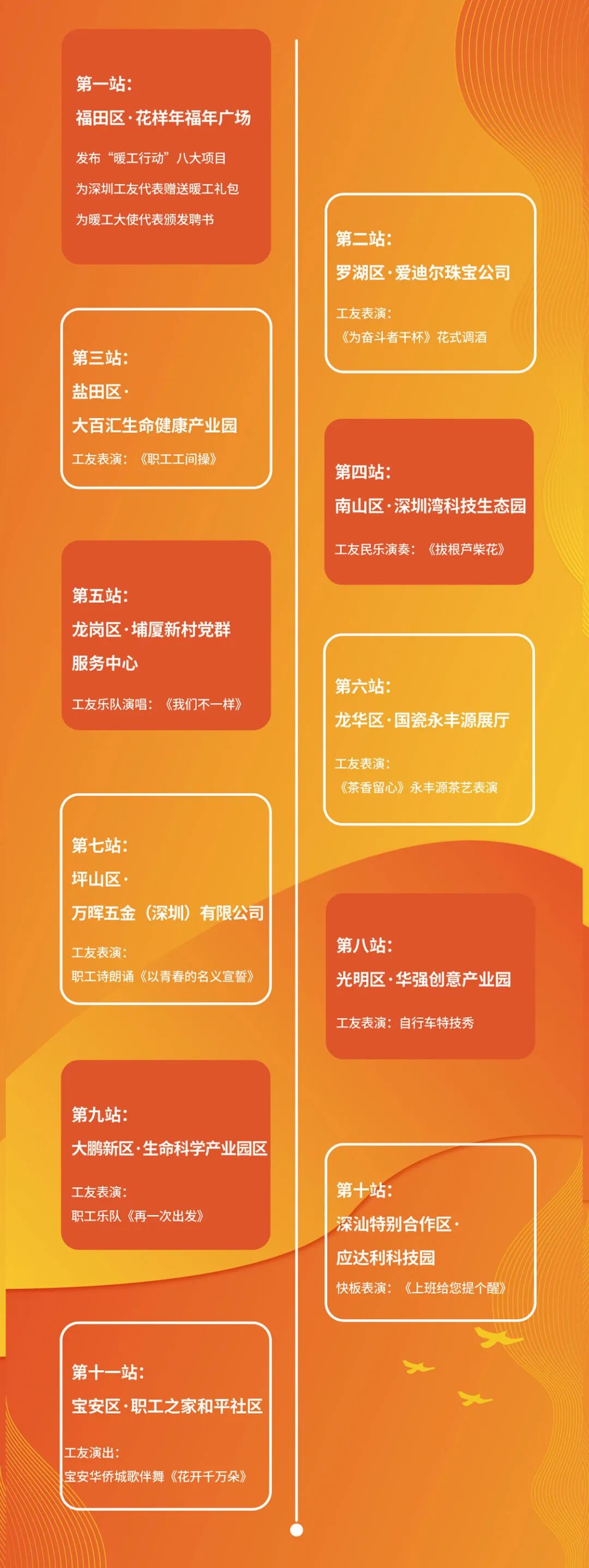 这是深圳首次在各区(新区、合作区)线上线下开展职工接力综合演艺活动。活动现场,深圳市总工会发布“暖工行动”八大暖心举措,并为“暖工大使”代表颁发聘书,向职工代表赠送“暖工礼包”。