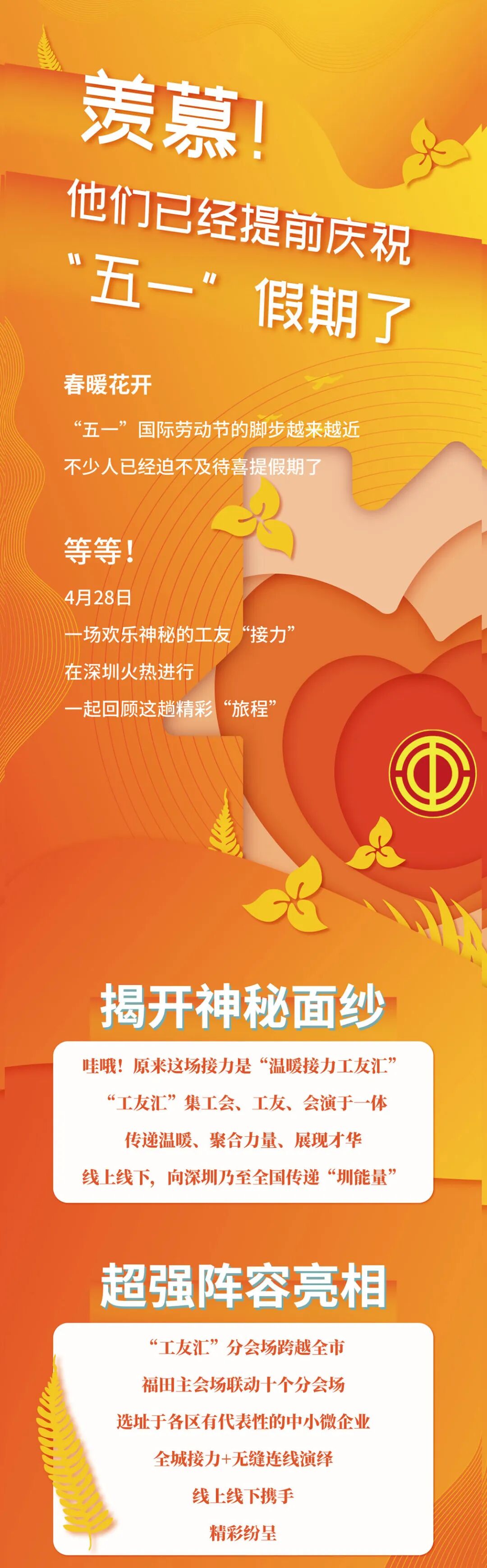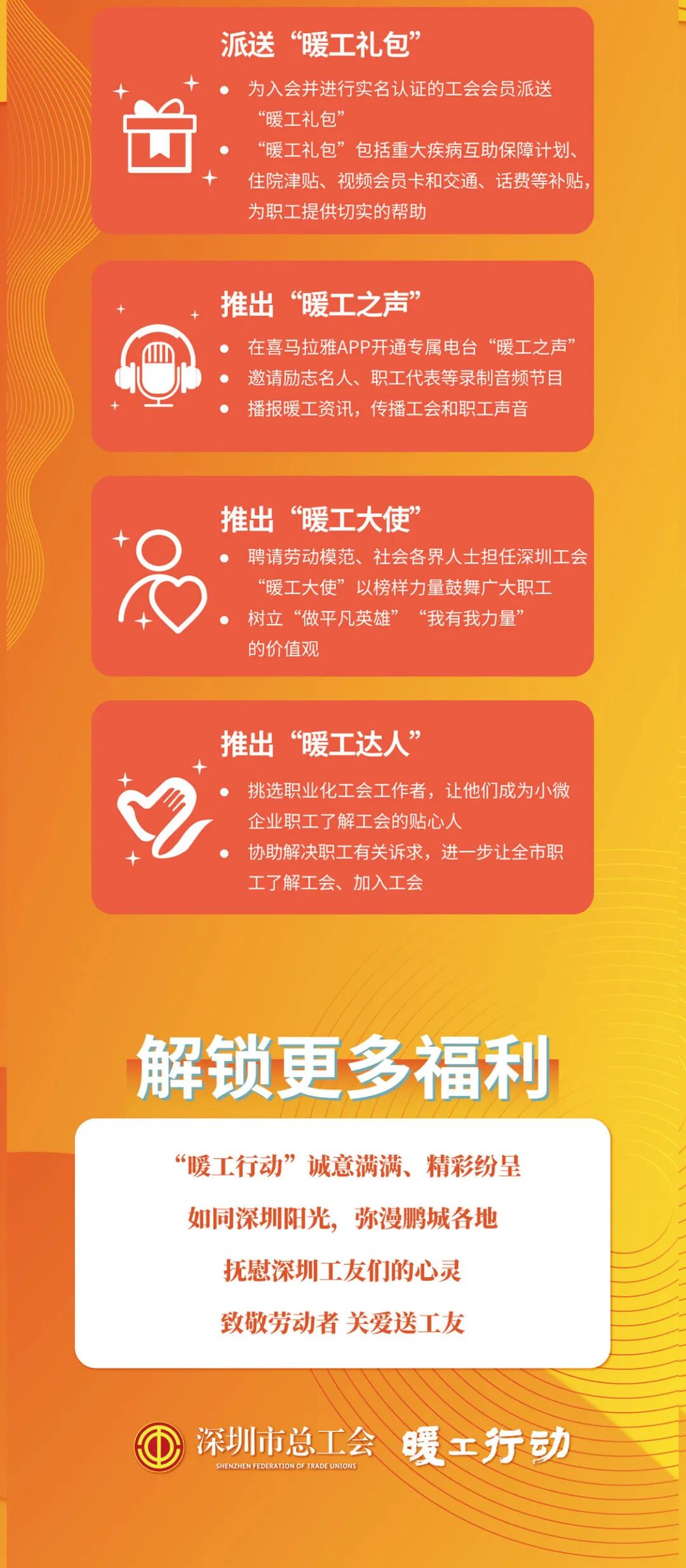 为关心关爱广大职工,为大家排忧解难,呼吁大家共克时艰,在“五一”国际劳动节即将到来之际,深圳市总工会精心策划“暖工行动”,向全市劳动者持续传递工会关爱和城市关怀。
