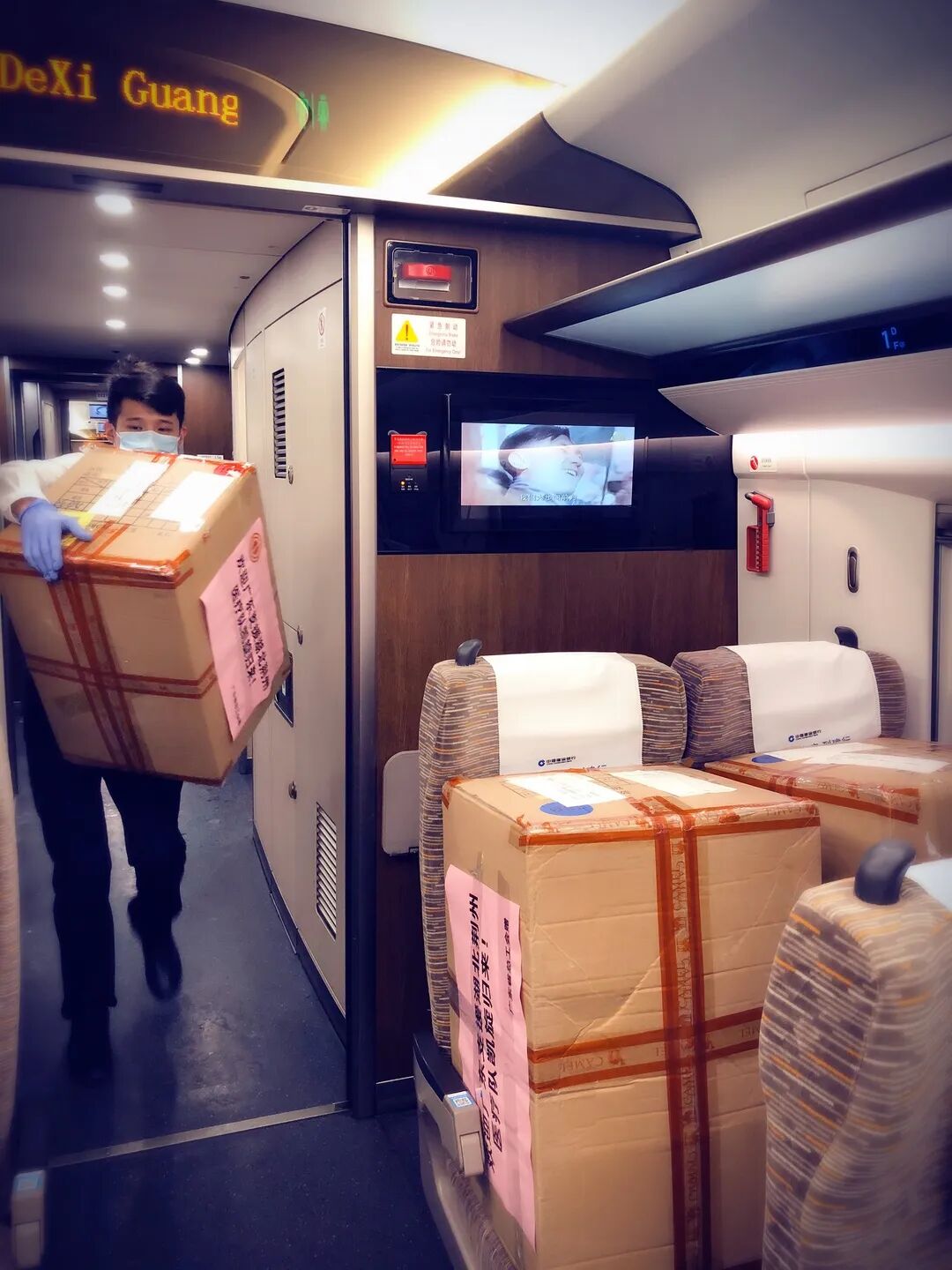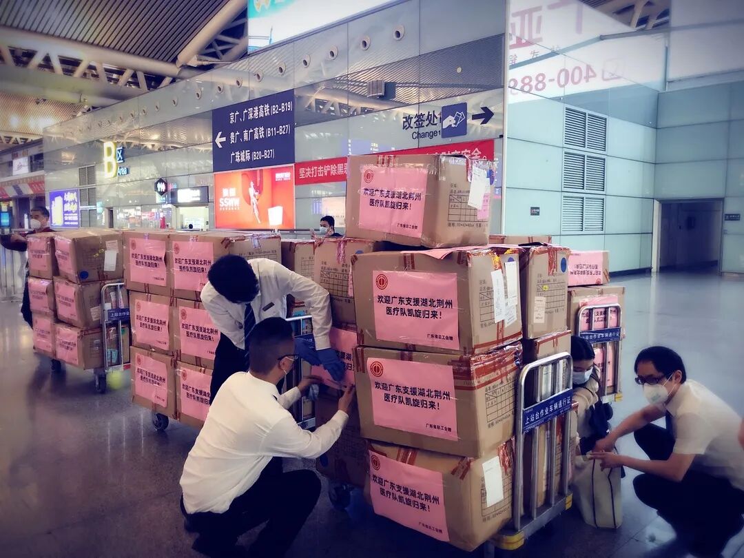 随着一声汽笛长鸣,3月19日8:10,一列载着650件冲锋衣的火车从广州南站出发驶往湖北荆州。这些崭新的冲锋衣是省总工会为即将归来的广东支援湖北荆州医疗队队员特别准备的队服。