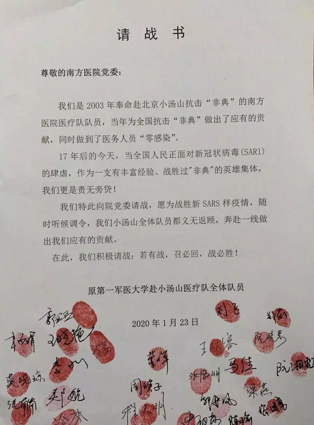 新冠肺炎疫情发生时,李利和当年小汤山队友写下援鄂”请战书“(李利供图)